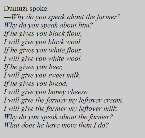 Here we see Dumuzi, the shepherd-god, offering increasingly valuable gifts to match the farmer’s produce. Well, the gifts are presumably listed in increasing value, assuming that a white wool garment is more valuable than a black wool garment and that “heart-turning” wine is better than “good wine” (which is itself better than “first wine”); however, this raises some issues. How is water-mixed wine the height of quality? So perhaps the pattern is inconsistent, or perhaps some of our translations are lacking because we don’t have the right context. It’s an interesting piece of text.